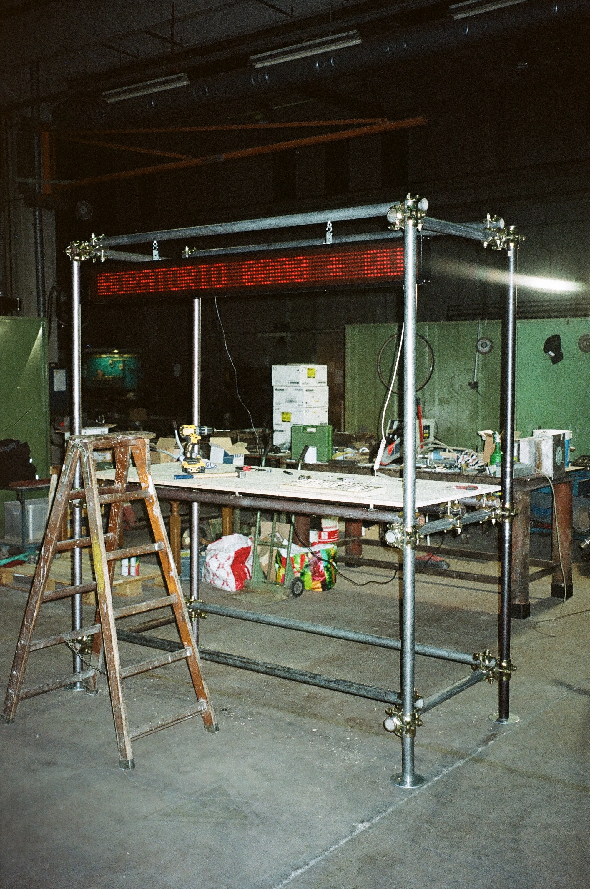È un muro all’M9. Il cantiere, quasi sempre edificio in potenza, diventa atto. L’impalcatura è la struttura di un muro abitato ed in questo caso l’abitare è il fare musica. Per natura, segue una logica di assemblaggio e lascia aperta la possibilità di mutare forma, espandendosi o riducendosi a seconda delle esigenze. Allo stesso modo accetta tutto ciò che è ornamento o arredo prevedendo che vi si possa agganciare, che siano luci o pelle.